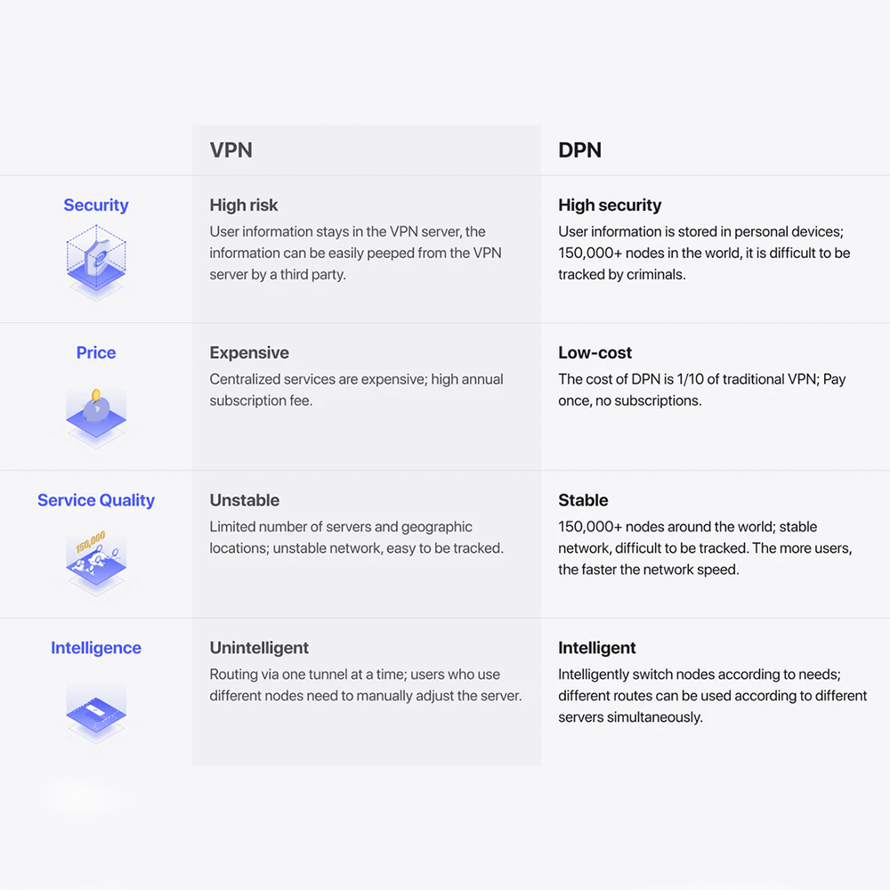 - No Centralized Control: DPN offers the benefits of VPN but with no centralized control over your data.